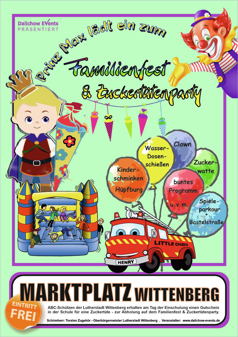 Jedes Jahr wird der Marktplatz in Wittenberg zum bunten Treffpunkt für die ganze Familie! Einmal im Jahr, 1-2- Wochen nach dem offiziellen Einschulungstermin lädt Dalichow Events zum fröhlichen Familienfest & Zuckertütenparty ein – bei freiem Eintritt!