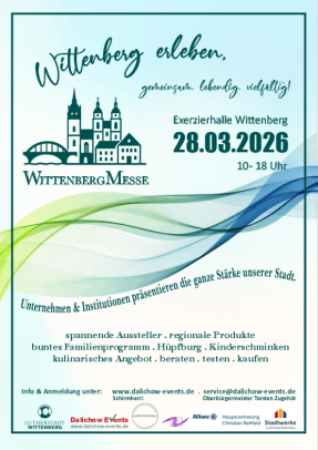 – ein Tag voller Ideen, Begegnungen und Inspiration. Ein abwechslungsreiches Bühnen- und Familienprogramm, Hüpfburg, Kinderschminken, zahlreiche Mitmachaktionen, regionale Produkte zum Testen und Kaufen, sowie Speis & Trank sorgen für beste Unterhaltung und gute Gespräche. Die Wittenberg Messe ist seit vielen Jahren ein fester Bestandteil des städtischen Lebens – ein Treffpunkt